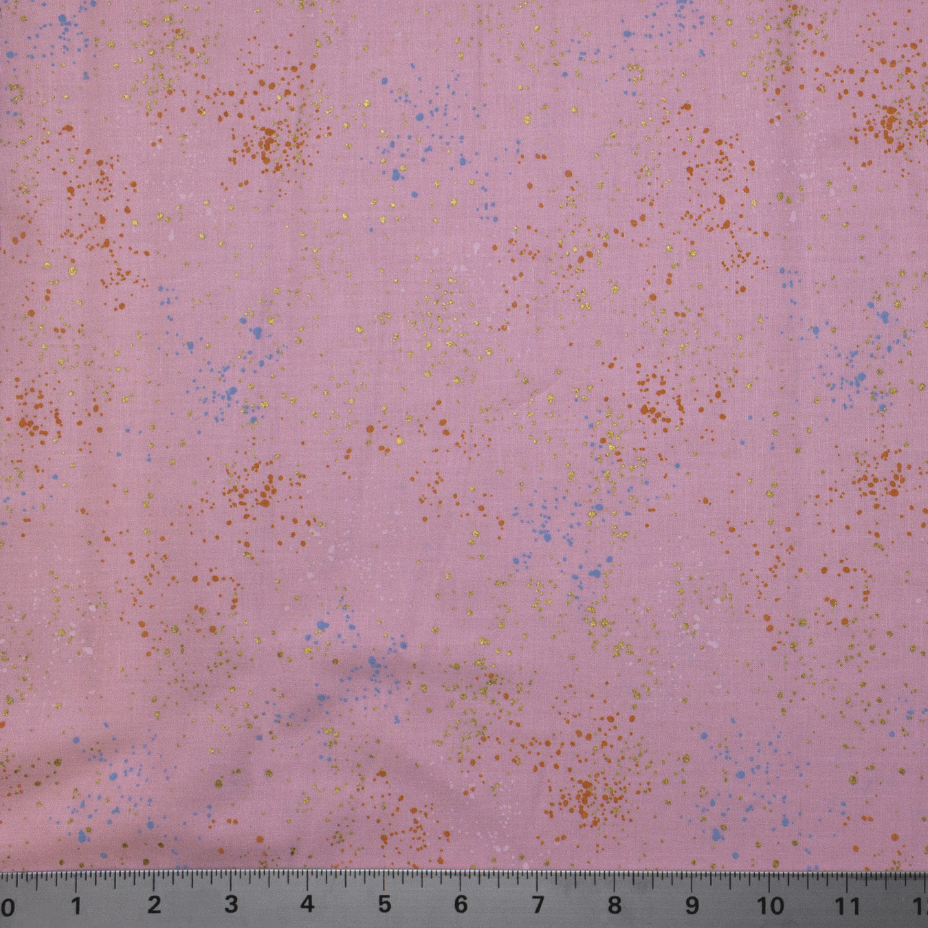 This Ruby Star Society basic features Rashida Coleman Hale’s paint-splatter print on soft, 100% quilting cotton. Speckled adds easy texture and movement to quilts, garments, bags, and more.This is a fabric with a light peachy pink background and metallic gold, red, blue, and off-white splatter throughout the design.