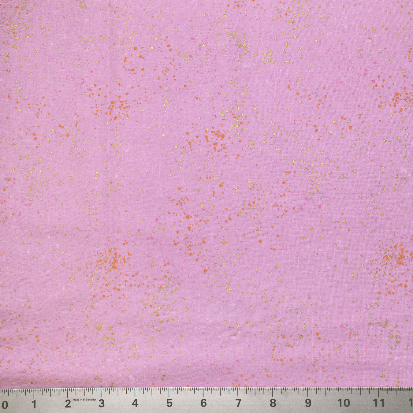This Ruby Star Society basic features Rashida Coleman Hale’s paint-splatter print on soft, 100% quilting cotton. Speckled adds easy texture and movement to quilts, garments, bags, and more.This is a fabric with a light purple-pink background and metallic gold, pink, orange, and off-white splatters throughout the design.