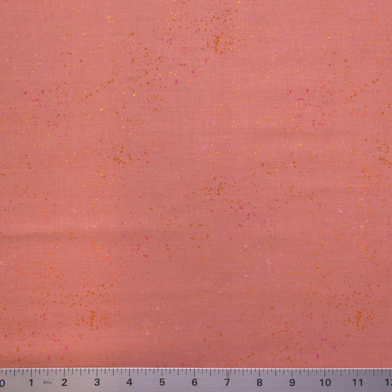 This Ruby Star Society basic features Rashida Coleman Hale’s paint-splatter print on soft, 100% quilting cotton. Speckled adds easy texture and movement to quilts, garments, bags, and more.This is a fabric with a medium pink background and metallic gold and purple splatters throughout the design.