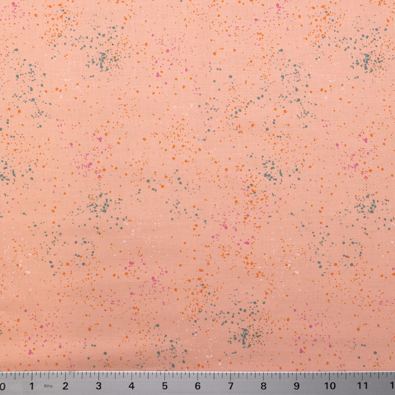 This Ruby Star Society basic features Rashida Coleman Hale’s paint-splatter print on soft, 100% quilting cotton. Speckled adds easy texture and movement to quilts, garments, bags, and more.This is a fabric with a light peach background and metallic gold, purple, blue, and off-white splatter throughout the design.