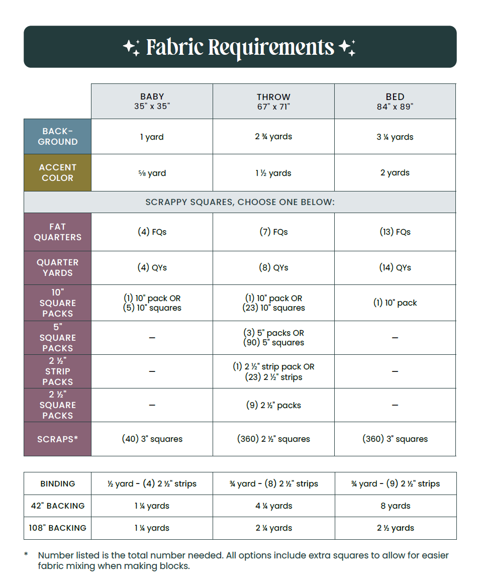 *Fabric requirements have been rounded up to the nearest 1/4 yd. You might have 1/8 yd extra for some colors.