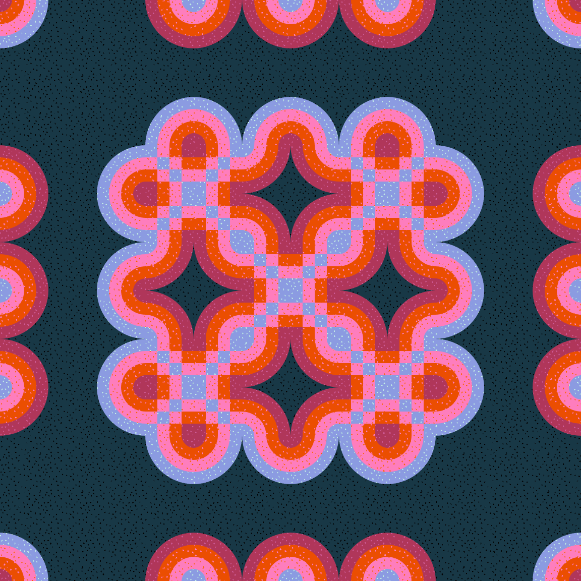 The Starry Smoke colorway pairs a light blue dusk color and bold pinks with rich reds and a dark blue background scattered with the tiny stars of the Starry print. It’s a palette that feels bright and playful while being grounded by the darker background color behind the striped curves of the quilt design.