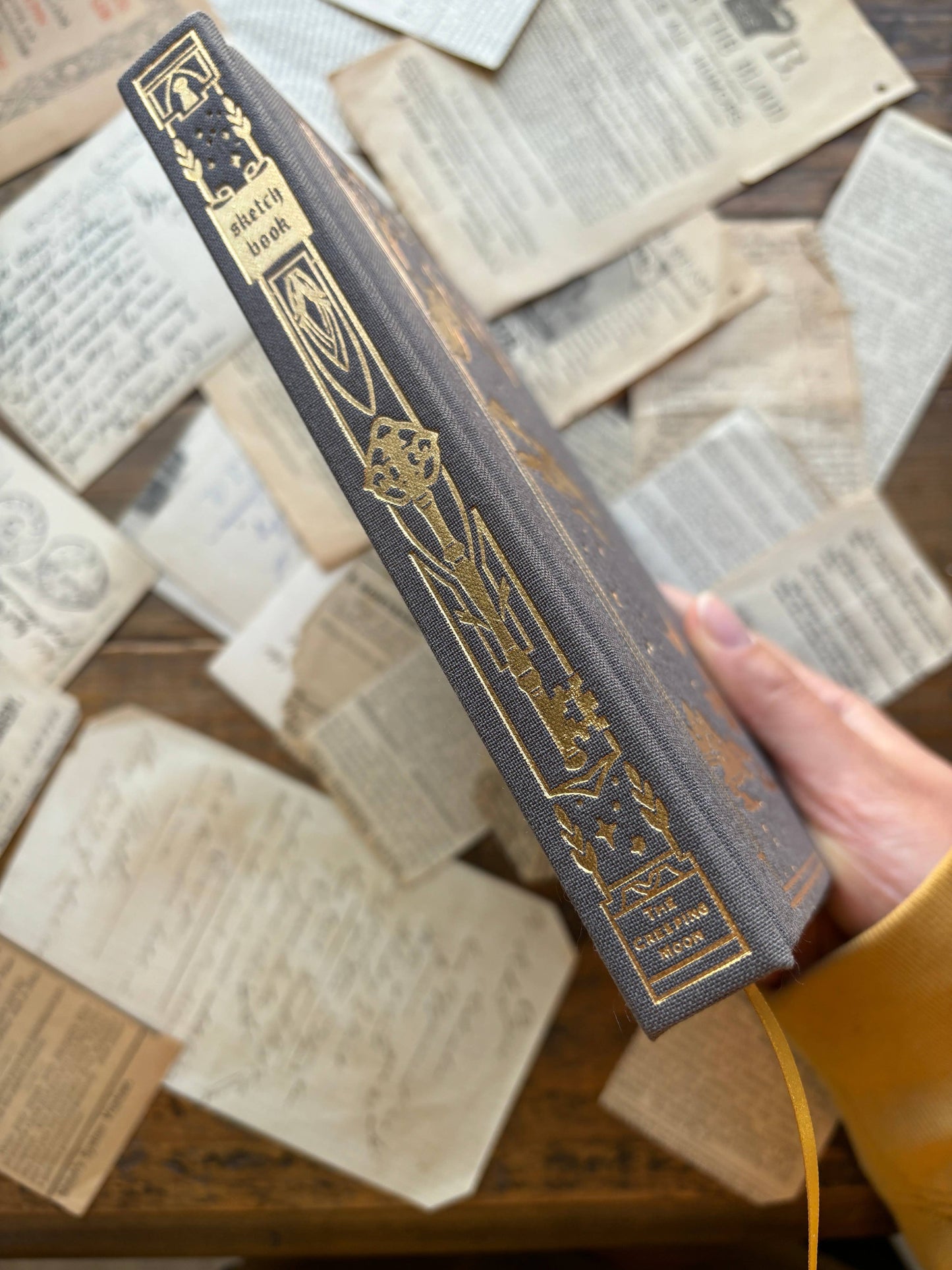 Dark grey linen hardcover with gold foil stamping on cover and spine