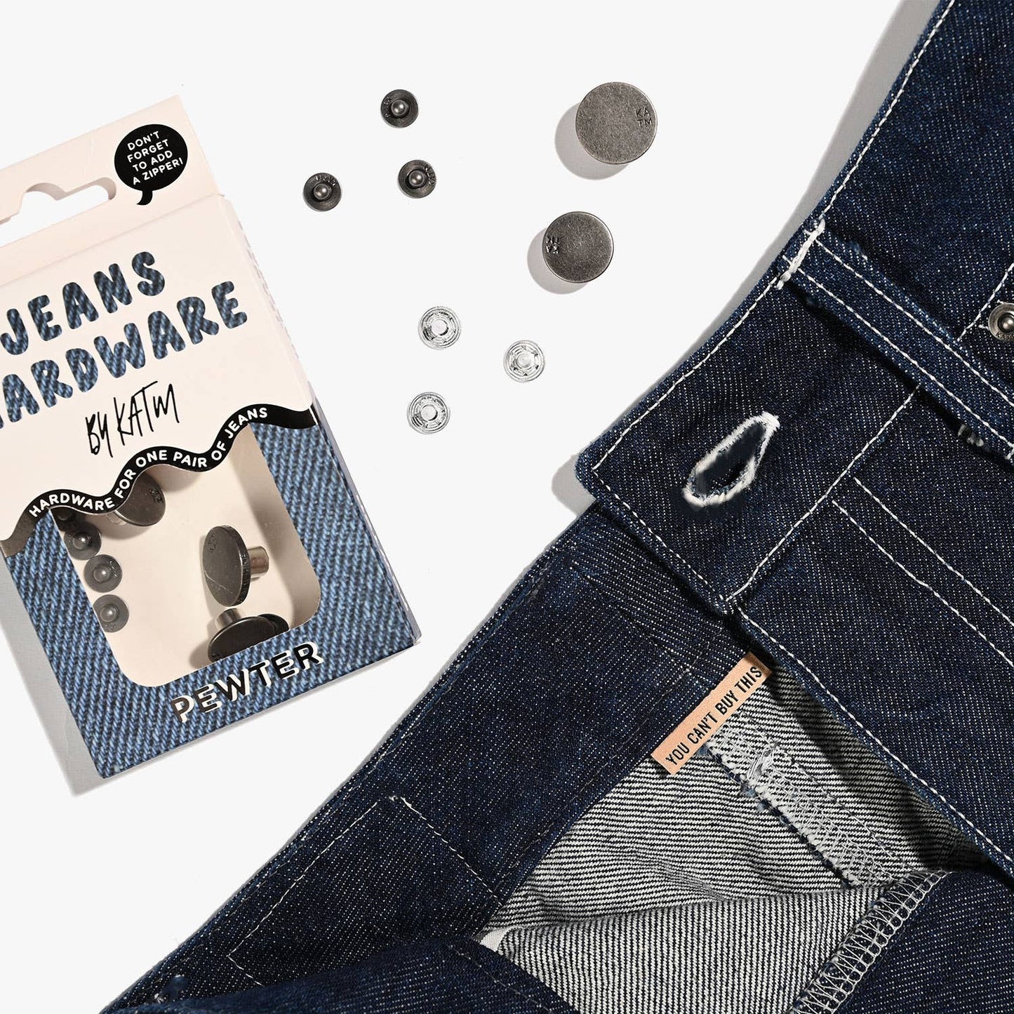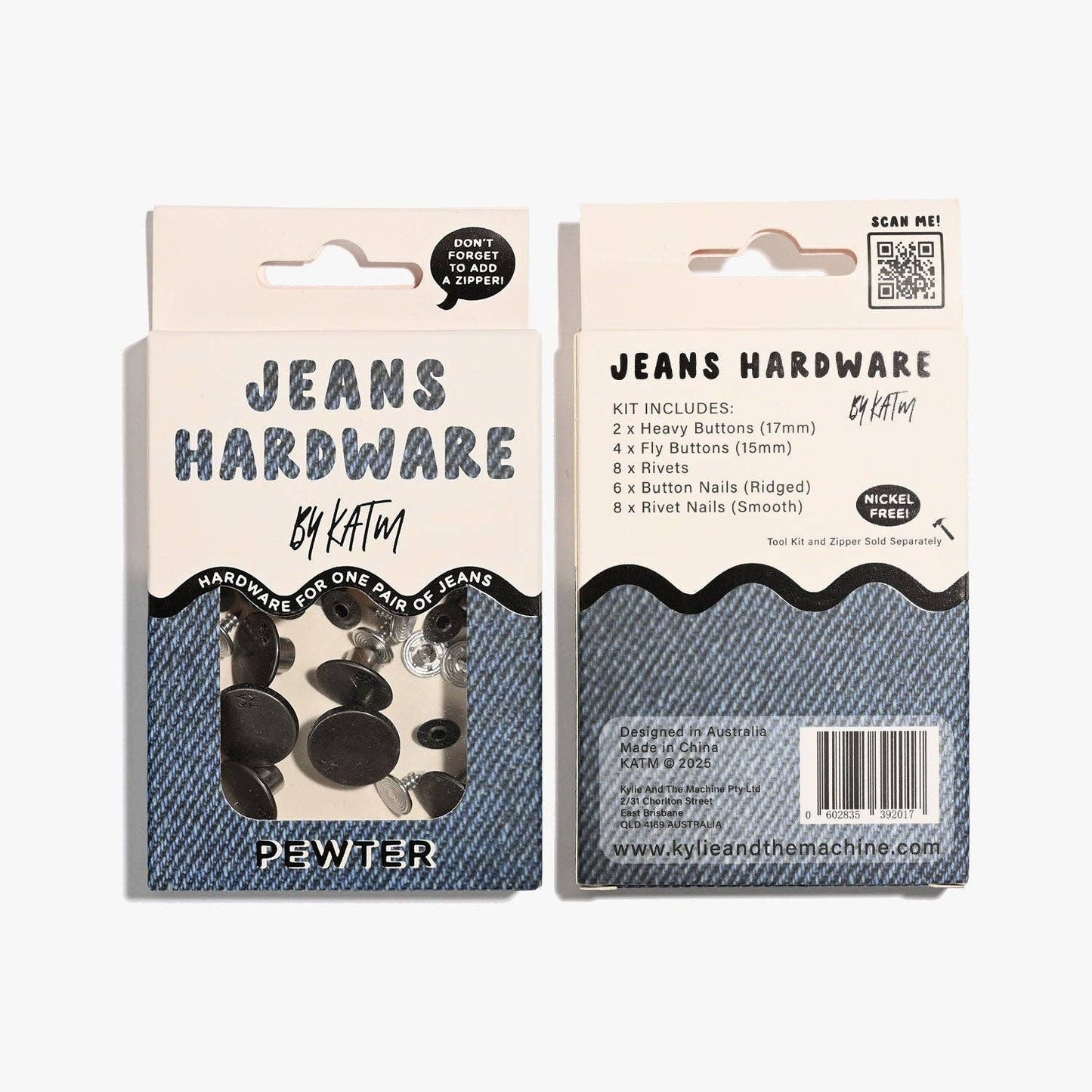 The KATM Jeans Hardware Kit contains the hardware required to complete your dream denim projects! The Pewter finish gives a nice classic look!