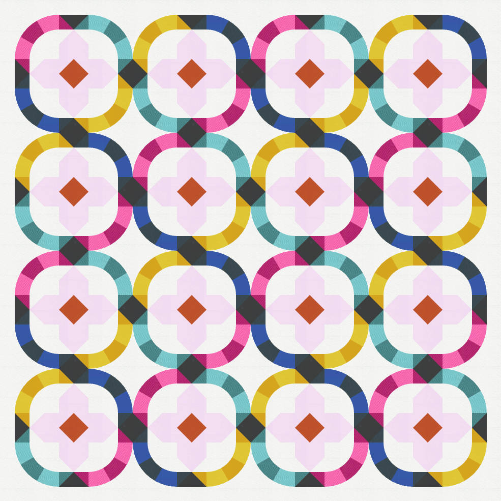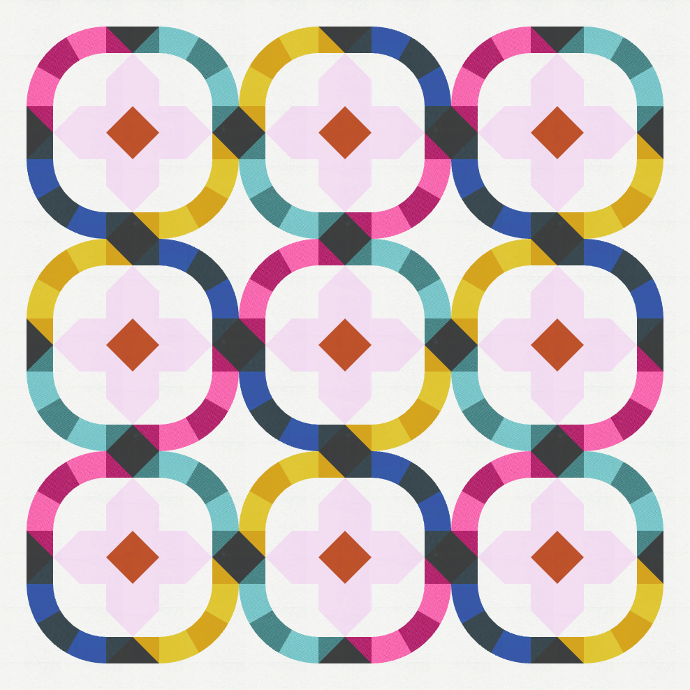 The Moonbeam quilt pattern is a fun modern take on the double wedding ring quilt! This quilt pattern is perfect for giving curves a shot. The cover-ish kit includes bella solids in a close range to the cover quilt from the pattern.