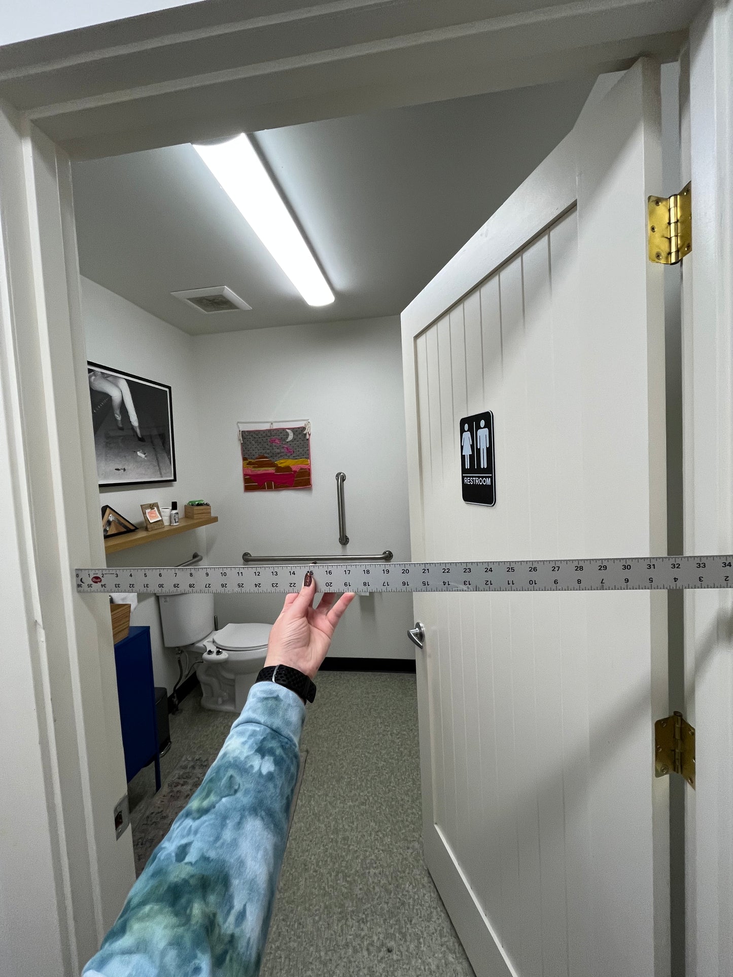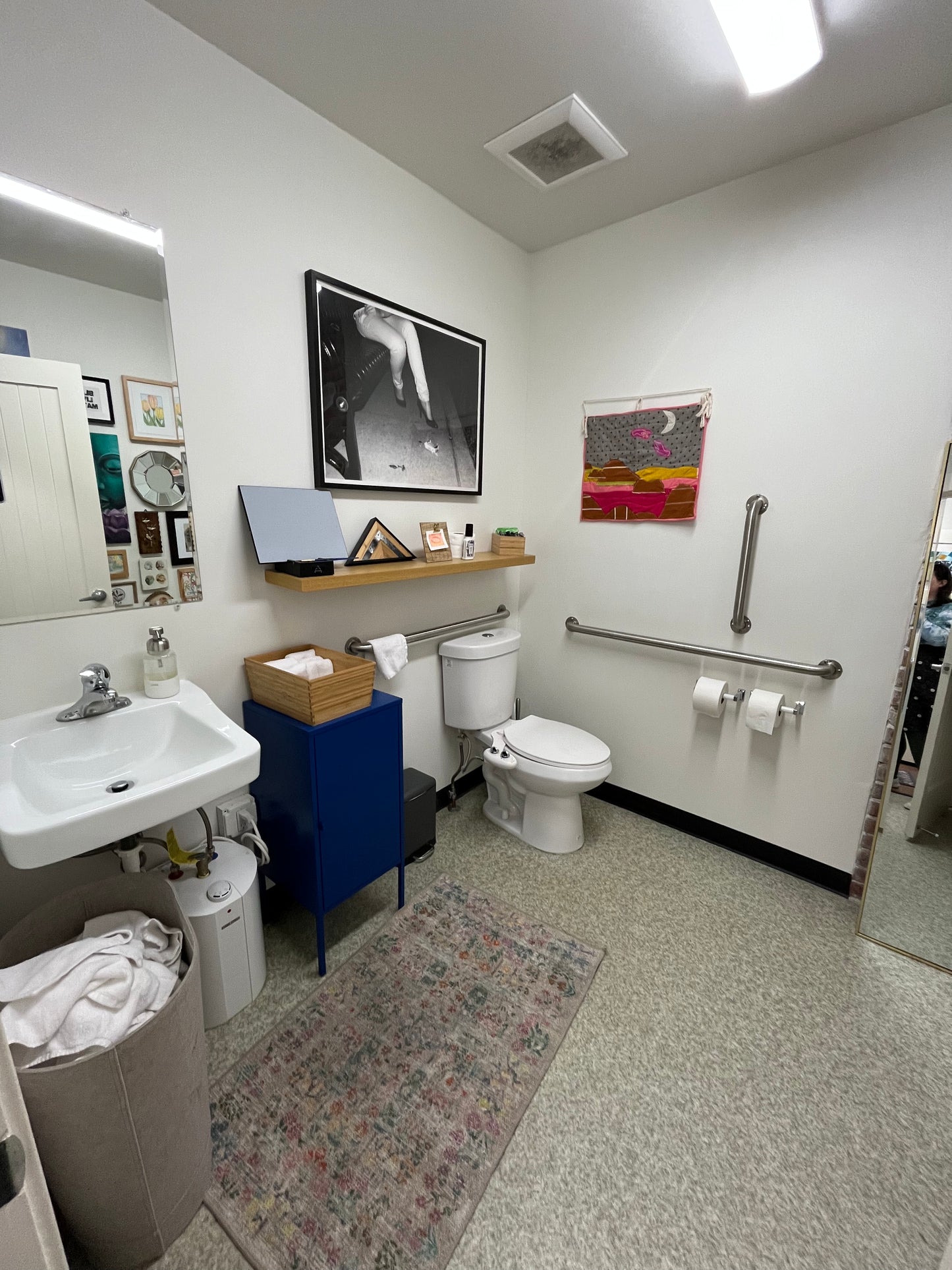 We have an all-gender restroom in the shop, equipped with handrails and sanitary supplies. While the door to the restroom is wide enough (35 ½ inches) to accommodate wheelchairs, the door to the back hall is only 29 ½ inches, which may not be wide enough for all users to access.