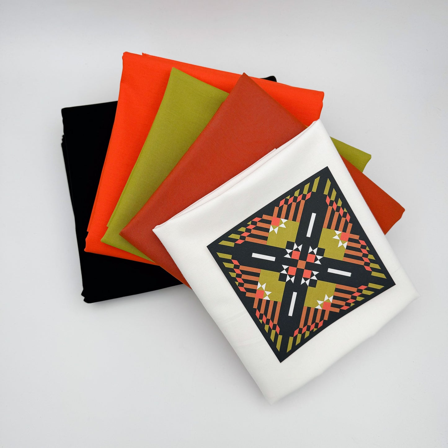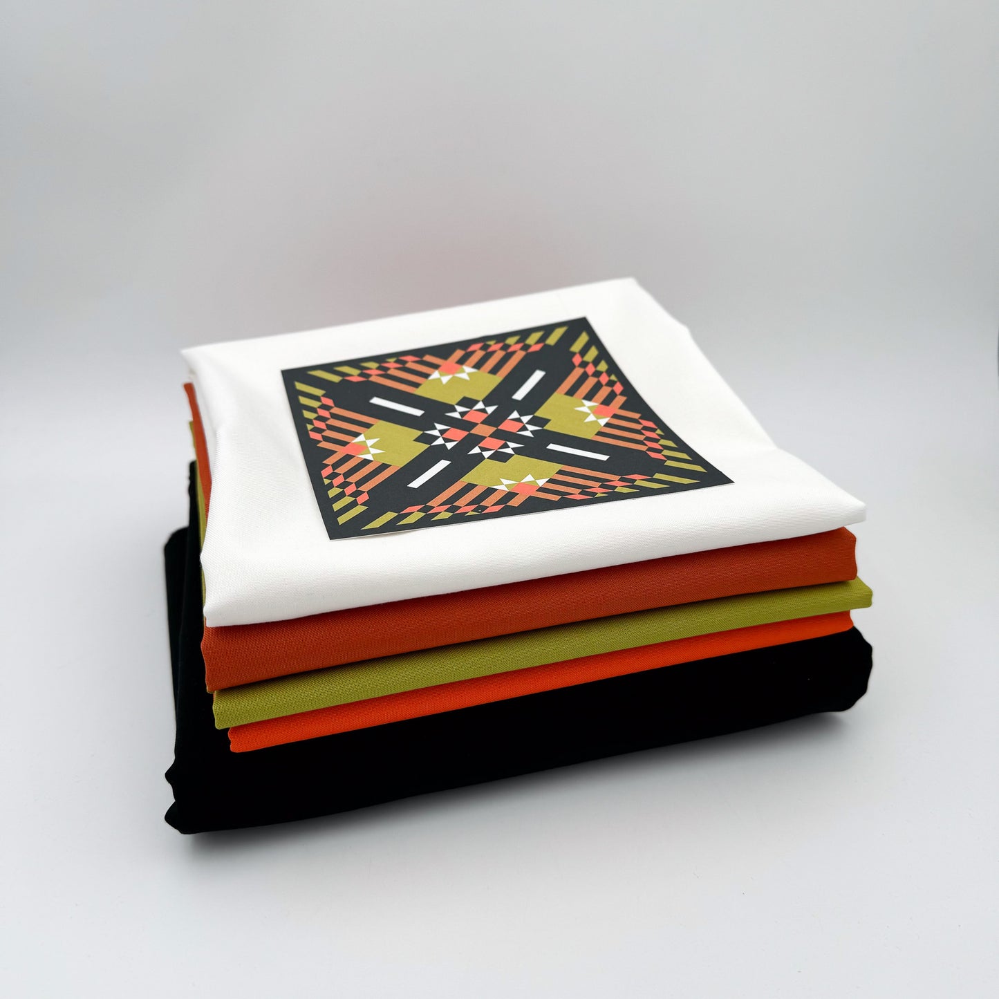 The quilt kit includes Bella Solids in a classic Halloween pallet of bright green, orange and black. Perfect for a Spooky Season make!